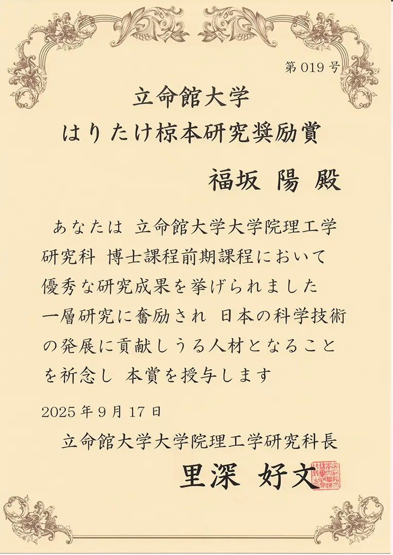 福坂 陽さん(M2)が、立命館大学はりたけ椋本研究奨励賞を獲得しました。