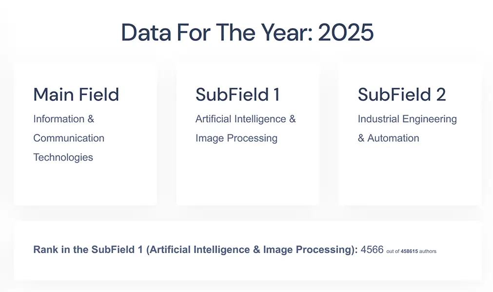 SubField 1はArtificial Intelligence & Image Processingで、458,615人中4,566位(上位1%未満)です。